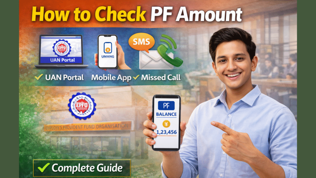 “How to Check PF Amount” The Employees’ Provident Fund (EPF) is a government-backed savings scheme managed by the Employees’ Provident Fund Organisation (EPFO) for salaried employees in India. Both the employee and employer contribute a fixed percentage of the employee’s salary every month to the PF account. This amount accumulates over time and can be withdrawn at retirement or under specific conditions such as unemployment, medical emergencies, or house purchase. Checking your PF balance regularly helps you track your savings, verify employer contributions, and plan your financial future. EPFO provides multiple easy ways to check your PF amount, including online portals, mobile apps, SMS, and missed call services.